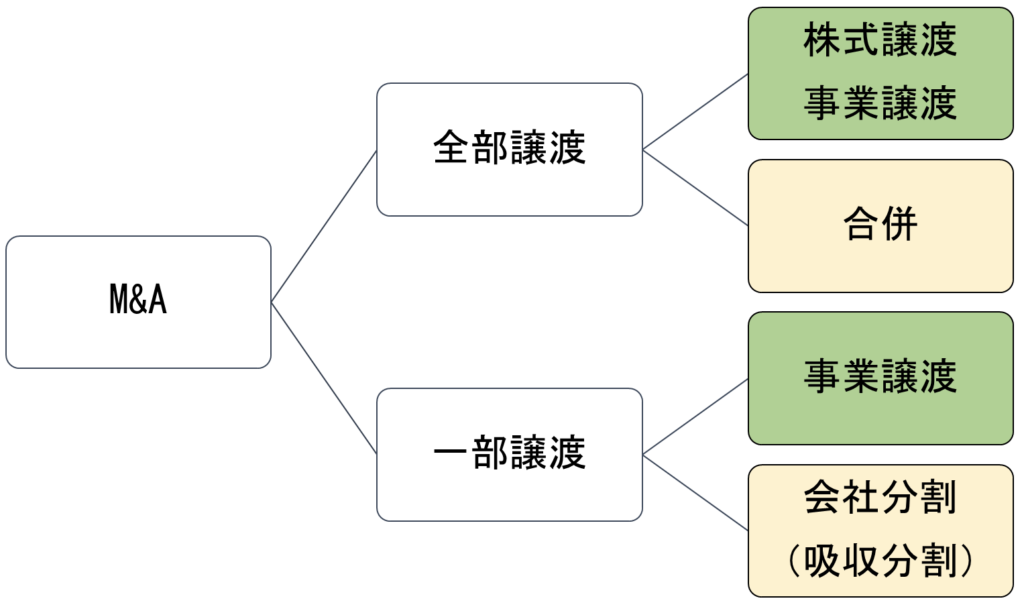 M&Aとは、英語のMergers(合併)and Acquisitions(買収)を省略した言葉ですが、日本においては、会社法の定める組織再編(合併や会社分割)に加え、株式譲渡や事業譲渡を含む、各種手法による事業の引継ぎ(譲渡・譲受け)をいいます。