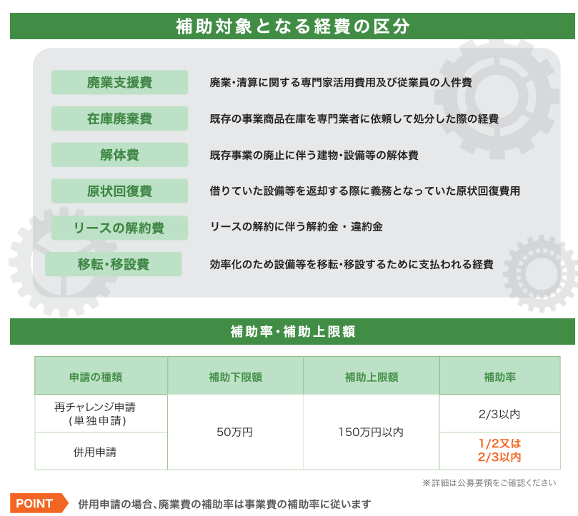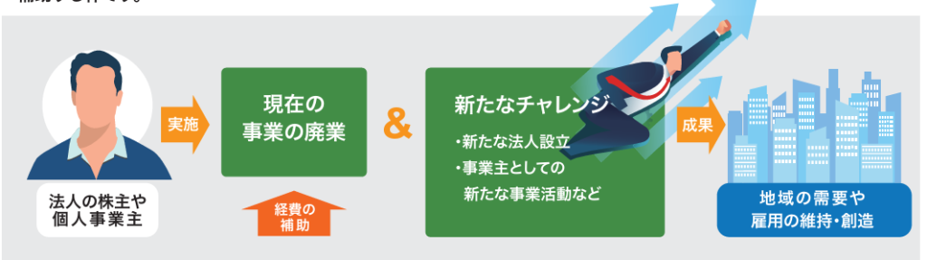廃業・再チャレンジ枠とは、M&Aによって事業を譲り渡せなかった中小企業者等の株主や個人事業主が、地域の新たな需要の創造や雇用の創出にも資する新たなチャレンジをするために、既存事業を廃業する場合にかかる経費の一部を補助する枠です。