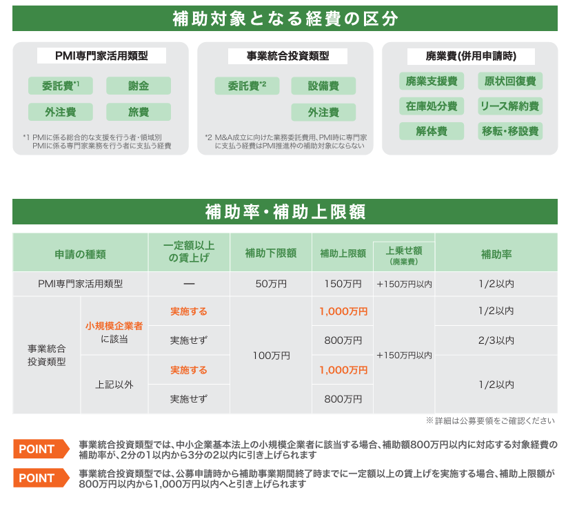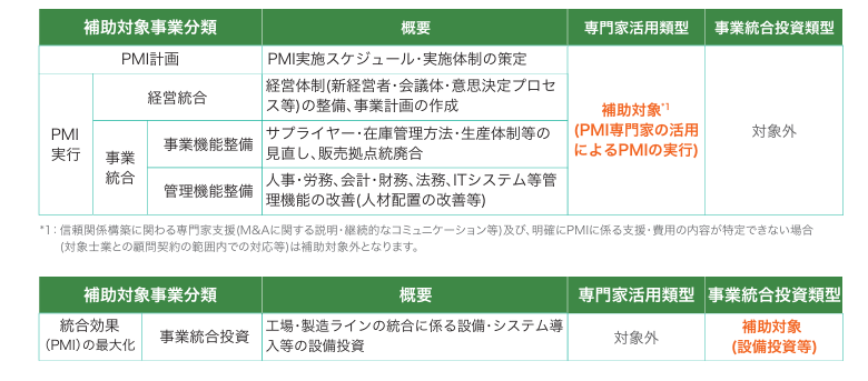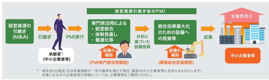 PMI推進枠とは、経営資源の引継ぎ(M&A)を行った又は行う予定の中小企業者及び個人事業主が、事業再編・事業統合等の取り組み(以下、「PMI」という。)に際して活用する専門家の費用及び統合に伴う設備投資費用等の一部を補助することによって、中小企業者等の事業再編・統合後の生産性向上を通じた経済の活性化を図ることを目的とした枠です。