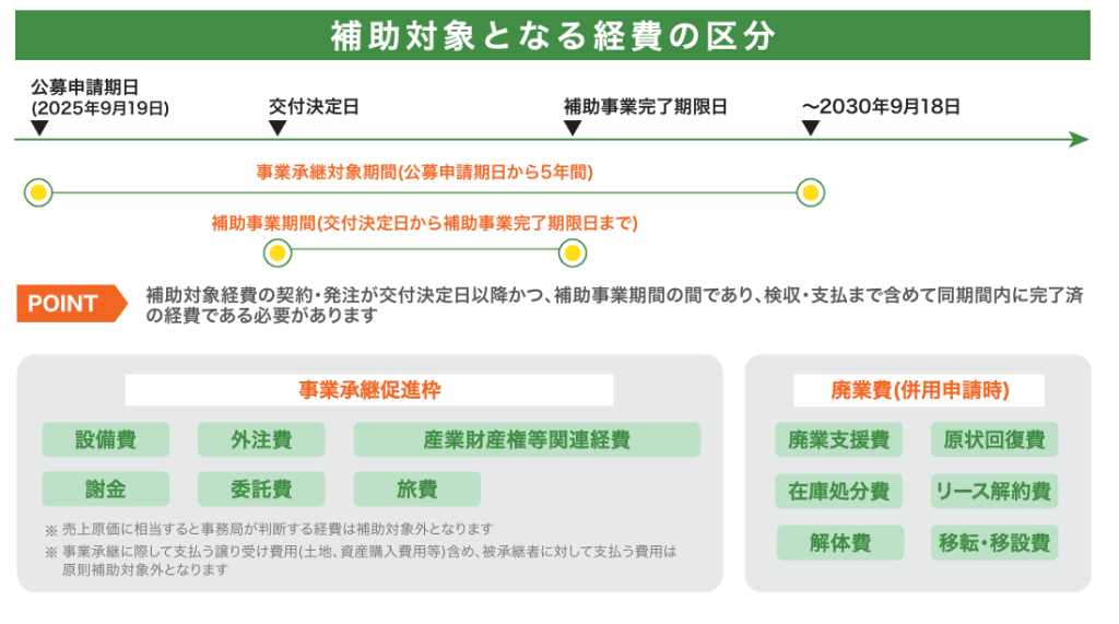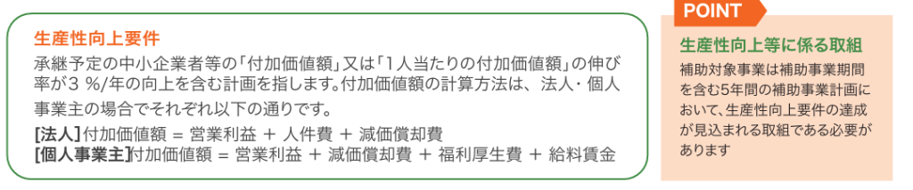 公募申請期日から5年後までの事業承継対象期間内に事業承継を完了すること、また事業承継により引き継ぐ経営資源を活用して行う生産性向上等に係る取組であることが条件となっています。