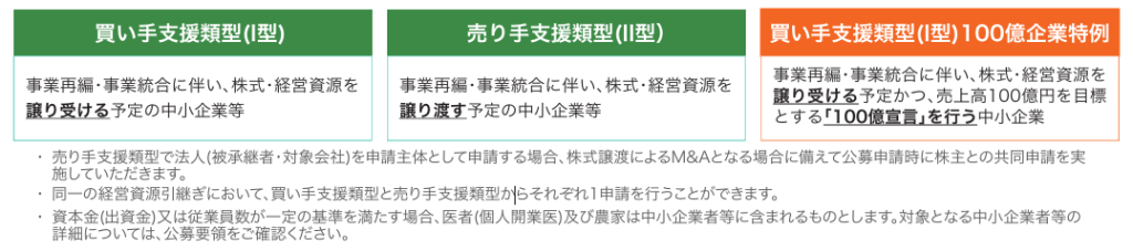M&A時の立場に応じて2つの支援類型と特例が存在します。