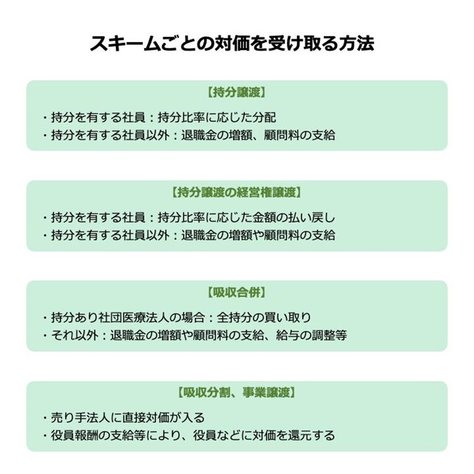 持分あり社団医療法人による経営権譲渡においては、退社する社員が退社前に買い手に持分を譲渡する手法と、退社後に法人から持分の払い戻しを受ける手法があります。前者の手法は持分譲渡と呼ばれます。持分譲渡の対価や持分の払い戻しがM&Aの対価としての意味を持ちます。