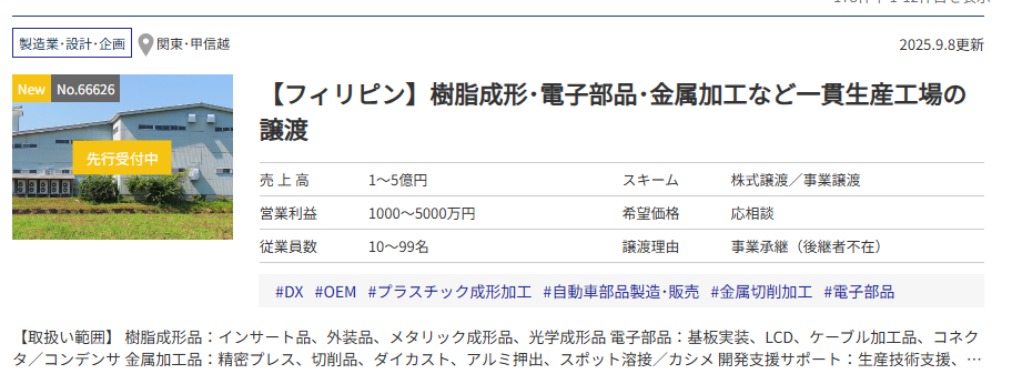 【フィリピン】樹脂成形・電子部品・金属加工など一貫生産工場の譲渡