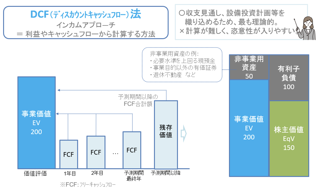 対象会社が生み出す将来のキャッシュフローを、適切な割引率(WACCと呼ばれる数%~十数%)で現在価値に還元して、「事業価値(EV)」を算定し、これに必要水準を上回る現預金や事業目的以外の有価証券などの「非事業用資産(いわゆる余剰資産)」を加算して「企業価値」を算出後、借入金やリース債務などの「有利子負債」を控除することで「株主価値」を計算する方法です。
