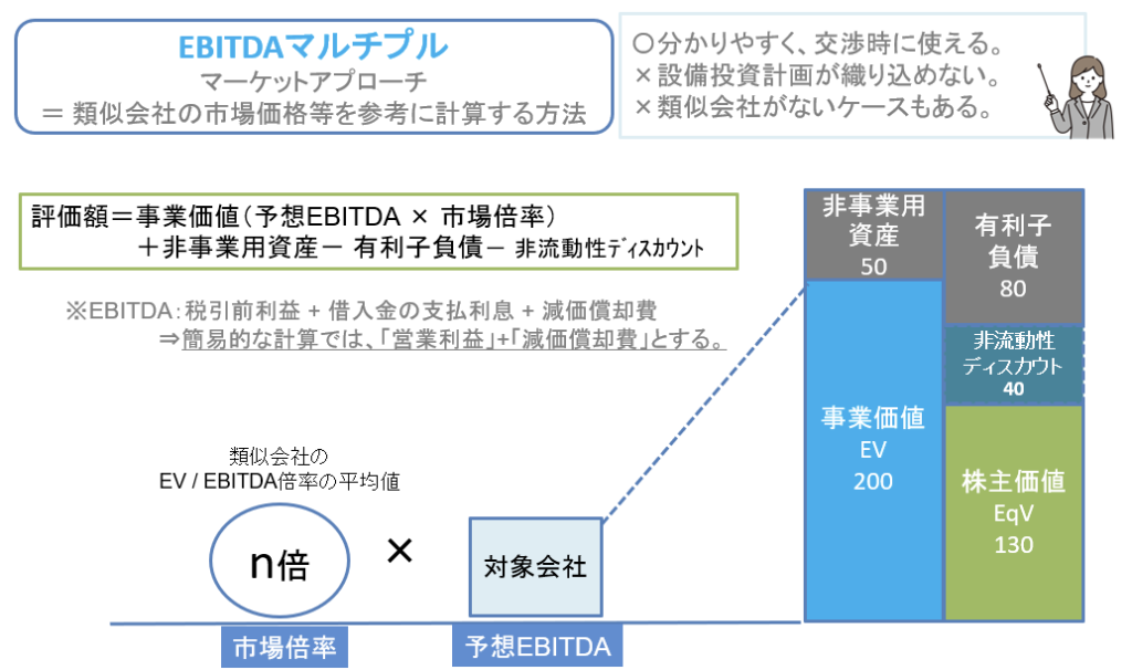 EBITDAマルチプルは、マーケットアプローチと呼ばれる、類似会社の市場価格や指標を参考に計算する方法です。