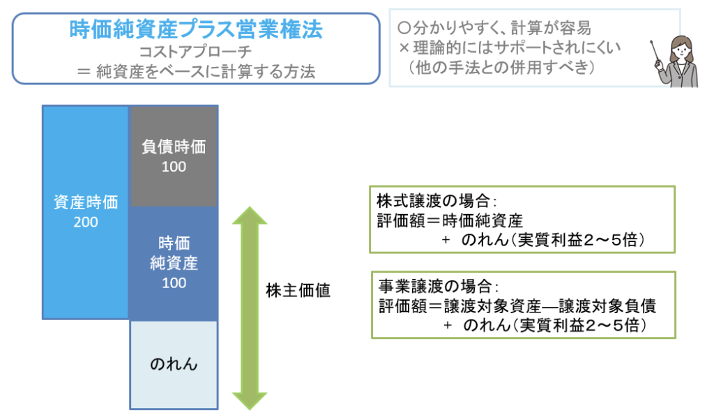 時価純資産+営業権法(年倍法)は、コストアプローチと呼ばれる、純資産をベースに計算する方法です。