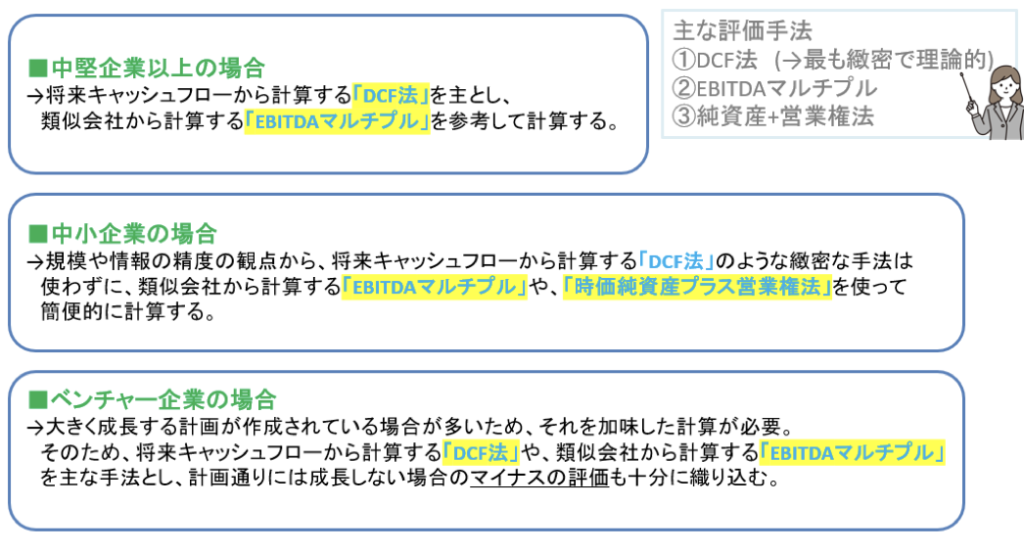 そのため、未上場の中堅企業と同様に、将来キャッシュフローから計算する「DCF法」や類似会社から計算する「EBITDAマルチプル」を主な手法とし、計画通りには成長しない場合の「マイナスの評価」も十分に織り込みます。
