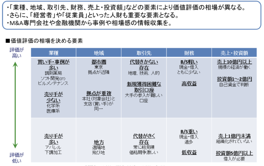 買い手や事例が多い業種(例えば、調剤薬局、介護、ソフトウェア開発、ビルメンテナンスなど)や売り手が少ない業種(化学系や医療系)は評価されやすい傾向にあります。